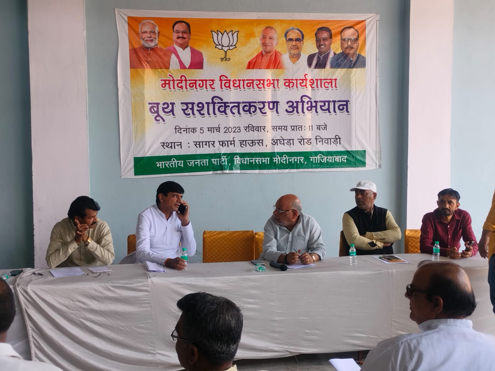 मोदीनगर। रविवार को कस्बा निवाड़ी स्थित सागर वाटिका फार्म हाउस में भारतीय जनता पार्टी द्वारा मोदीनगर विधान सभा की बूथ सशक्तिकरण कार्यशाला का आयोजन। कार्यशाला में मुख्य वक्ता जिला प्रभारी प्रदेश उपाध्यक्ष व राज्यसभा सांसद कांता कर्दम , मोदीनगर विधायक डॉक्टर मंजू शिवाच , गाजियाबाद भाजपा अध्यक्ष दिनेश सिंघल रहे। मोदीनगर देहात मंडल अध्यक्ष विपिन त्यागी ने सभी का धन्यवाद किया। इस क्रम में बूथों को मजबूत करने के लिए सभी लोगों ने मिलकर दृढ़ संकल्प लिया ।