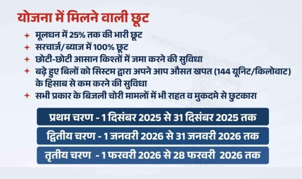 यह बिजली बिल माफी योजना तीन चरणों में लागू की गई है। पहले चरण में, जो 1 दिसंबर 2025 से 31 दिसंबर 2025 तक रहेगा, उपभोक्ताओं को कुल बकाया राशि पर पूरे 25% की छूट मिलेगी। दूसरे चरण में, जिसका समय 1 जनवरी 2026 से 31 जनवरी 2026 तक तय किया गया है, उपभोक्ताओं को 20% की छूट दी जाएगी। तीसरा चरण 1 फरवरी 2026 से 28 फरवरी 2026 तक लागू रहेगा, और इस दौरान बिल जमा करने वाले उपभोक्ताओं को कुल राशि पर 15% की छूट मिलेगी। इसका मतलब है कि जितना जल्दी आप बिल चुकाएंगे, उतना अधिक लाभ आपको मिलेगा।