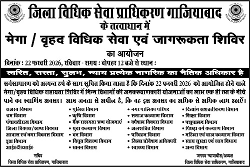 गाजियाबाद। आम नागरिकों को त्वरित, सस्ता और सुलभ न्याय उपलब्ध कराने की दिशा में 22 फरवरी 2026 को आयोजित होने जा रहा मेगा विधिक सेवा एवं जागरूकता शिविर कई मायनों में ऐतिहासिक पहल माना जा रहा है। जिला विधिक सेवा प्राधिकरण के तत्वावधान में आयोजित यह शिविर प्रशासन और जनता के बीच सीधा संवाद स्थापित करने का सशक्त मंच बनेगा।